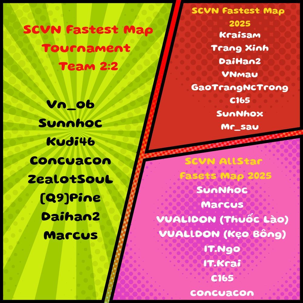– Đây là giải đấu dành cho các game thủ có trình độ trung bình và thấp của Cộng Đồng SCVN. Các game thủ thi đấu ở thể loại Fastest Map thuộc hệ thống SCVN Tournament 2025 đã có thành tích sẽ không được tham dự. (Tham khảo danh sách đính kèm).